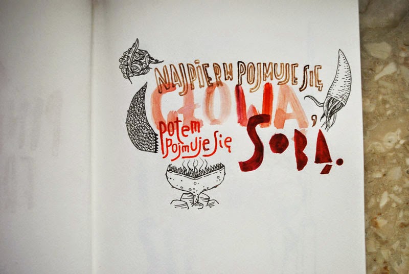 No to oswajam - szkicownik ze mną, a w tym - trochę też siebie, jakby na nowo, ze szkicowaniem. Za oswajanie zabieram się między jednym projektem a drugim, w chwilach, w których akurat komputer zapisuje pracę dla klienta. Wtedy hyc - po szkicownik, po kilka kresek dla siebie, od siebie, bez deadline'u, briefu, oczekiwania końca czy obowiązkowego "ładnie". Trzy rzeczy naraz (bo briefy jednak tuż obok, a w kuchni - proces śniadaniowy), więc kolejna porcja pestek na patelni przypalona. Truizm, ot - życie inspiruje: